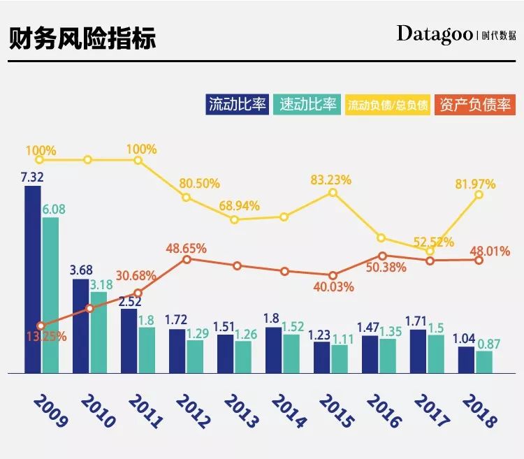 以上数据显示,流动比率已经连续7年都低于2,速动比率也在2018年度跌破1。流动比率是流动资产对流动负债的比率,数值低于2说明流动负债跟常规相比低了点;速动比率是企业速动资产与流动负债的比率,速动资产是流动资产扣除存货后的资产额,速动比率一般等于1比较合适,因为流动负债往往是马上要到期的负债,如果没有马上可以变现的资产来支持的话,易因偿还不了债款而宣布破产。