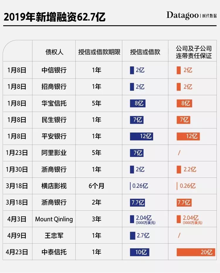 除此以外,为了解决现金流问题,今年初以来,华谊兄弟还将娱乐投资100%股权、英雄互娱20.17%股份、东阳浩瀚65.8%股权、东阳美拉70%股权、华谊影城(苏州)14.29%股权、10家影院未来五年经营票房收入等资产先后进行质押,向中信银行、招商银行、浙商银行、华宝信托、民生银行、平安银行6家机构申请授信共计40.7亿元。同时,公司还向阿里影业、横店影视、王忠军个人借款共计9.96亿元。