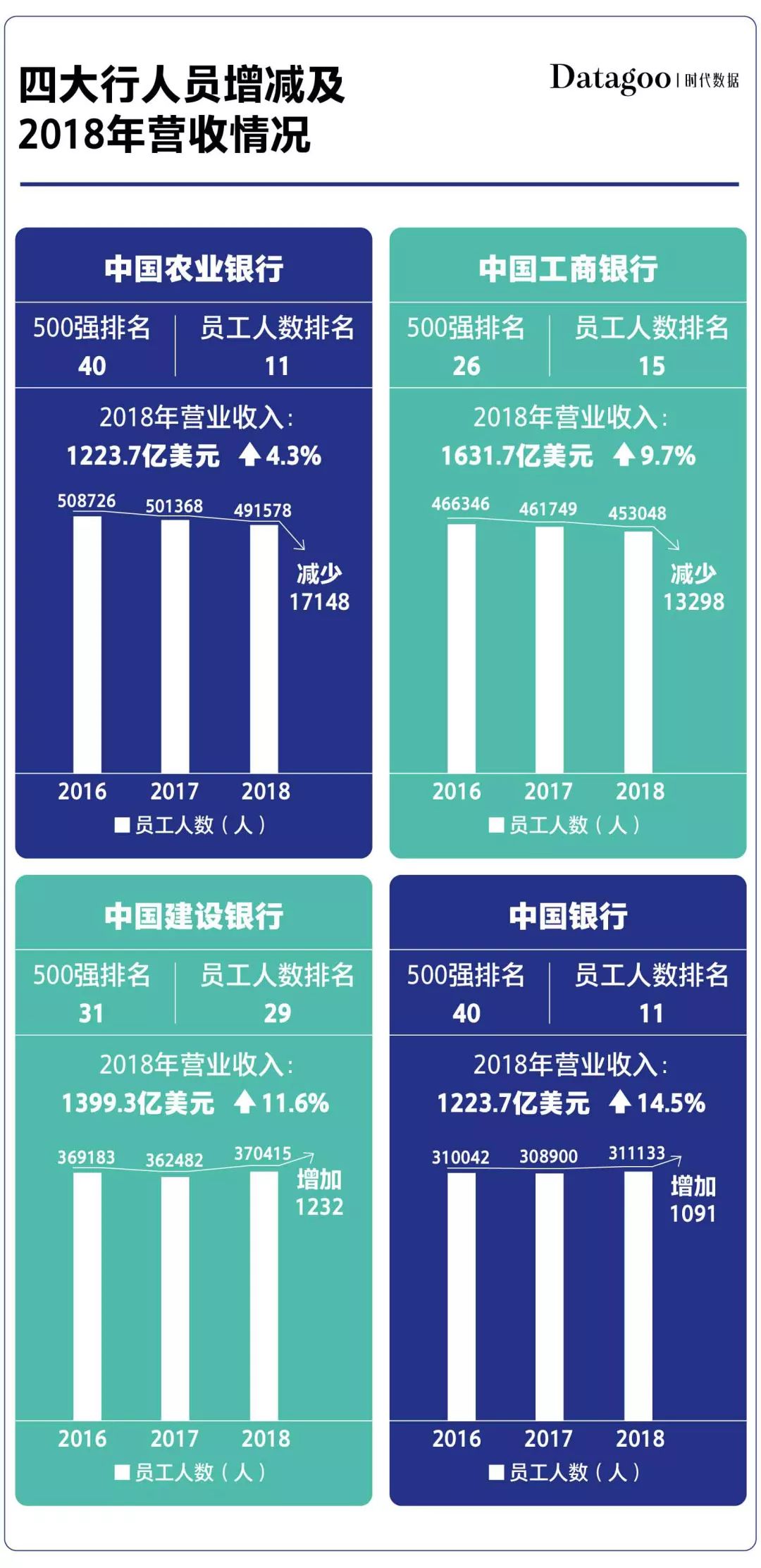 然而在大力推广金融科技的背景下,“科技解放人”的浪潮持续推进,虽然四大行处境出现好转,但银行减员的趋势愈演愈烈。据近三年美国《财富》发布500强中50家员工人数最多的企业排行榜,时代数据统计得出,四大行中农行减员人数最多,整体减少1.7万人,其次是工商银行,整体减少1.3万人。