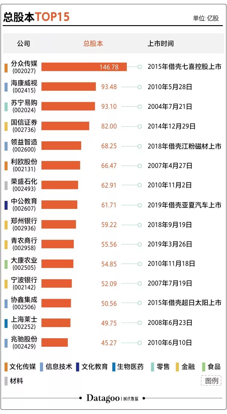 另据时代数据梳理,在总股本排名前15名的公司中,除了分众传媒外,还有领益智造、中公教育、协鑫集成3家是通过借壳实现上市。此外,最早首发上市的是苏宁易购,也是在中小板开板当年上市,至今上市也有近15年了。最年轻的公司是来自青岛的青农商行,今年3月26日才登陆中小板。