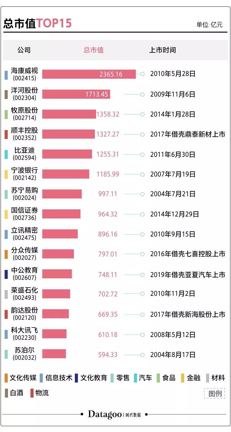 据上图所示,在总市值前十五的公司中,来自信息技术领域的公司最多,有3家,其次是物流、金融、零售各2家,白酒、汽车、食品、文化传媒、文化教育和材料各一家。此外,两家零售公司苏宁易购和苏泊尔均是在中小板开板当年首发上市,另有4家是通过借壳登陆中小板市场,分别是顺丰控股、分众传媒、中公教育和韵达股份。