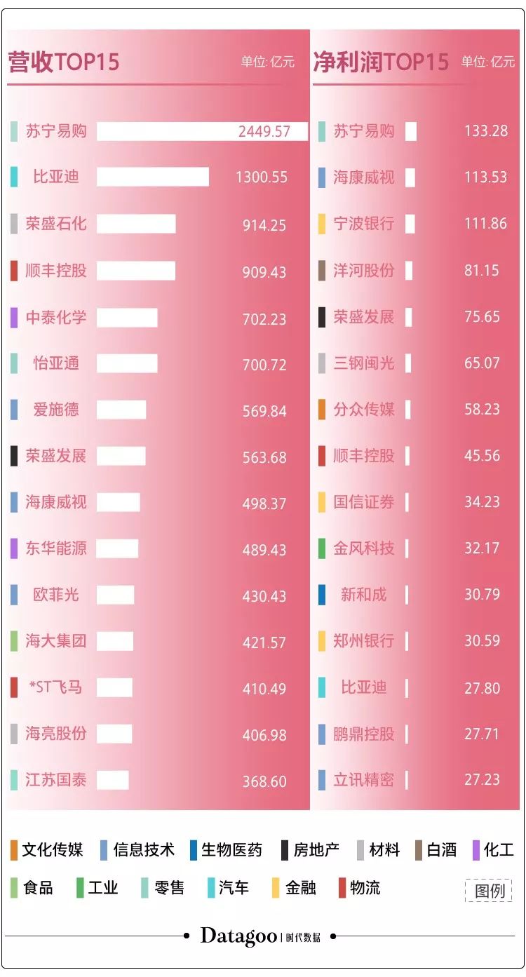 据上图所示,在营收前十五的公司中,包括苏宁易购在内共有3家来自零售行业,信息技术也有3家,其次是材料、物流、化工各2家,汽车、房地产、食品各一家;在净利润前十五的公司中,信息技术和金融行业排第一,各有3家,其次是零售、白酒、房地产、材料、文化传媒、物流、工业、生物医药、汽车各一家。同时上榜的除了苏宁还有比亚迪、顺丰控股、荣盛发展、海康威视。