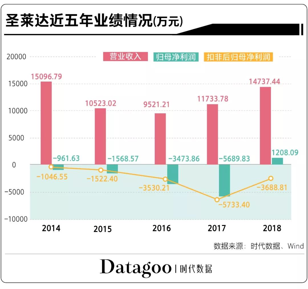 2018年5月10日,圣莱达收到证监会《行政处罚决定书》显示,圣莱达2015年度年报合计虚增收入和利润2000万元,虚增净利润1500万元,虚增行为导致圣莱达2015年度扭亏为盈。因此,在剔除了虚增资产的数据之后,2015年实际营收仅有1.05亿元,亏损1568.57万元。实际上的圣莱达从2014年至2017年已经连续四年业绩出现亏损,本该早早退市。