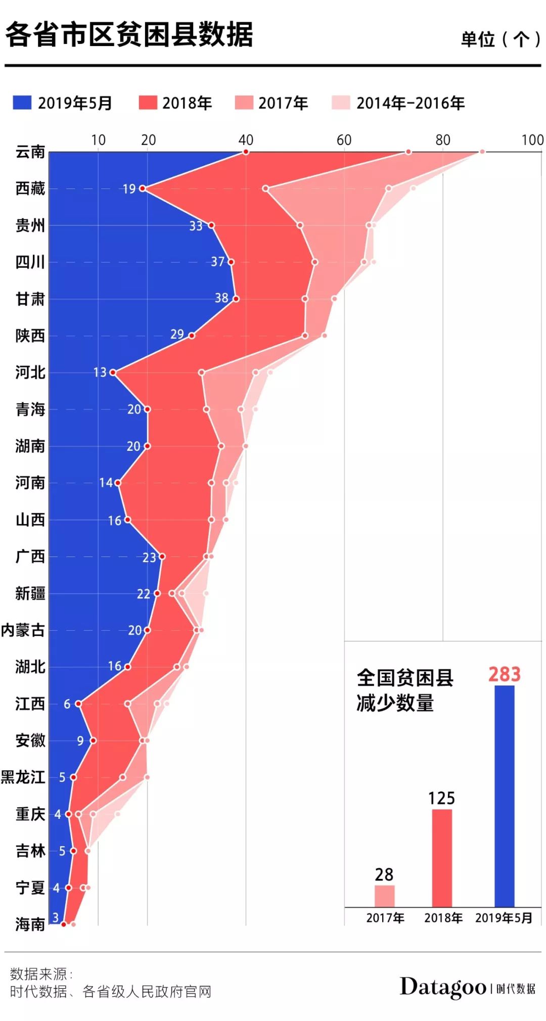 根据2019年5月数据,今年已有283个贫困县通过了省级专项评估检查并由各省级人民政府宣布脱贫摘帽,也是中西部22个省市区第一次均有贫困县减少。据时代数据统计,在这一批脱贫摘帽名单中,云南的贫困县摘帽数量最多,达到33个;其次是西藏和陕西,分别有25个县和23个县摘帽。此次摘帽后,贫困县数据最多的还是云南,共有40个县尚未脱贫摘帽;其次为甘肃和四川,各有38个和37个。