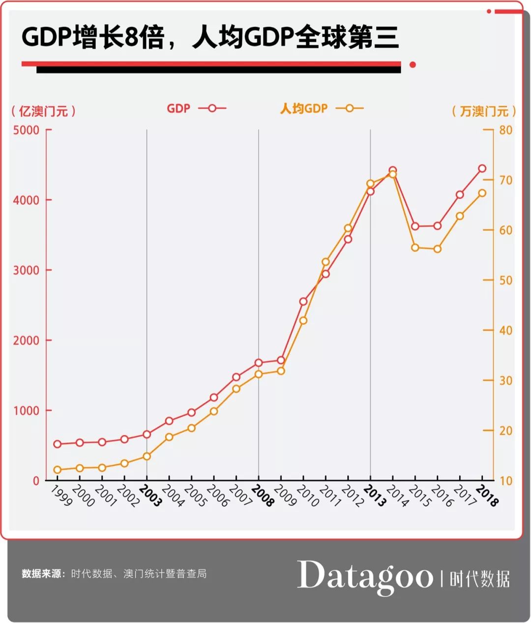 同时,澳门的人均GDP也水涨船高,到2018年已经达到67.35万澳门元(约合8.34万美元),是20年前的5.5倍。据国际货币基金组织发布的2018年世界人均GDP排名显示,中国澳门位列全球第三,仅次于卢森堡和瑞士。