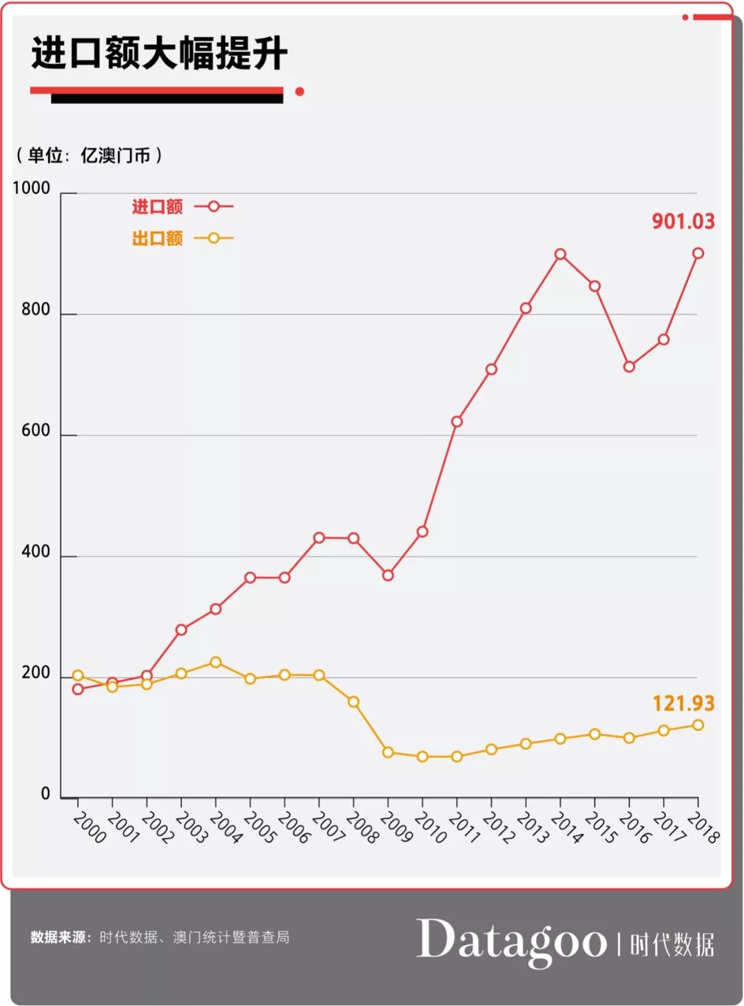 在贸易方面,澳门逐渐扩大进口,充分发挥进口的重要作用,即满足了居民对美好生活的积极向往,又推动形成了澳门全面开放的新格局,从另一方面也促进了博彩旅游业的发展。澳门的贸易总额从2000年的384.78亿澳门元增长至2018年的1022.96亿澳门元。其中,进口额从2000年的180.98亿澳门元增长至2018年的901.03亿澳门元,增长了四倍。