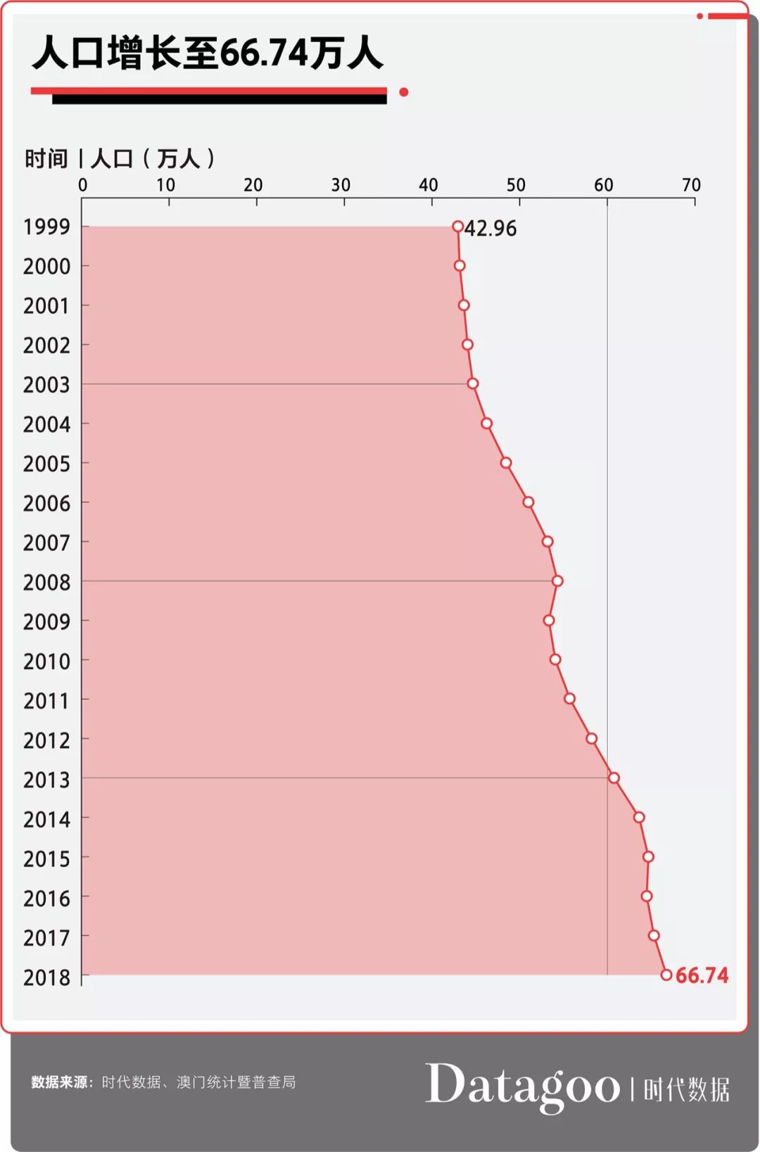 作为社会生活主体的人口也得到进一步增长。澳门居民人口从1999年的42.96万人增长到2018年的66.74万人。