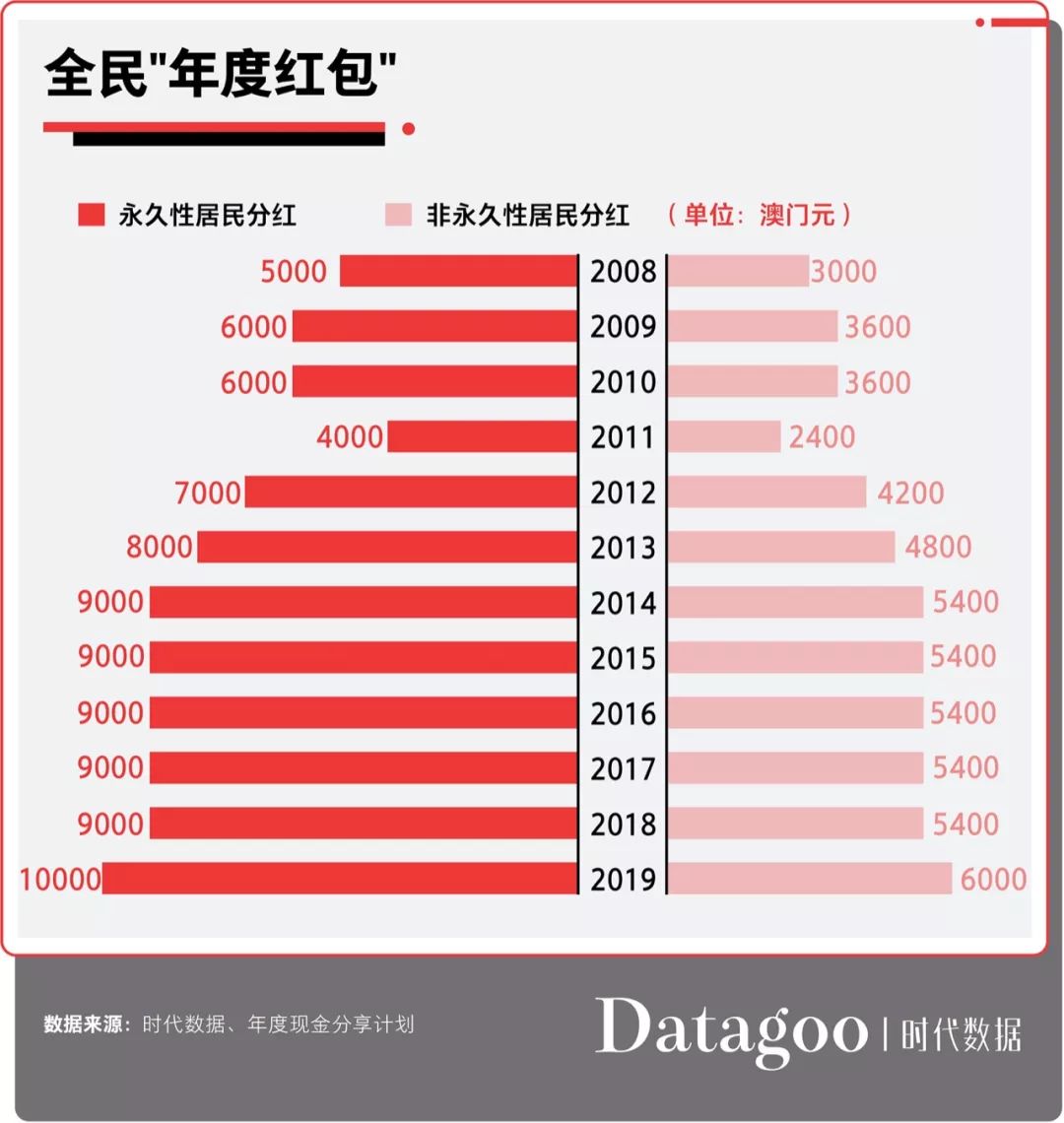 政府财政宽裕了,也没忘了回报一直以来为澳门经济做出贡献的居民们。2008年,澳门政府首次提出“年度现金分享计划”,向每名澳门永久性居民发放5000澳门元、非永久性居民拨发3000澳门元的现金分红。到了2019年,每名永久性居民已经升至1万澳门元,非永久居民升至6000澳门元。