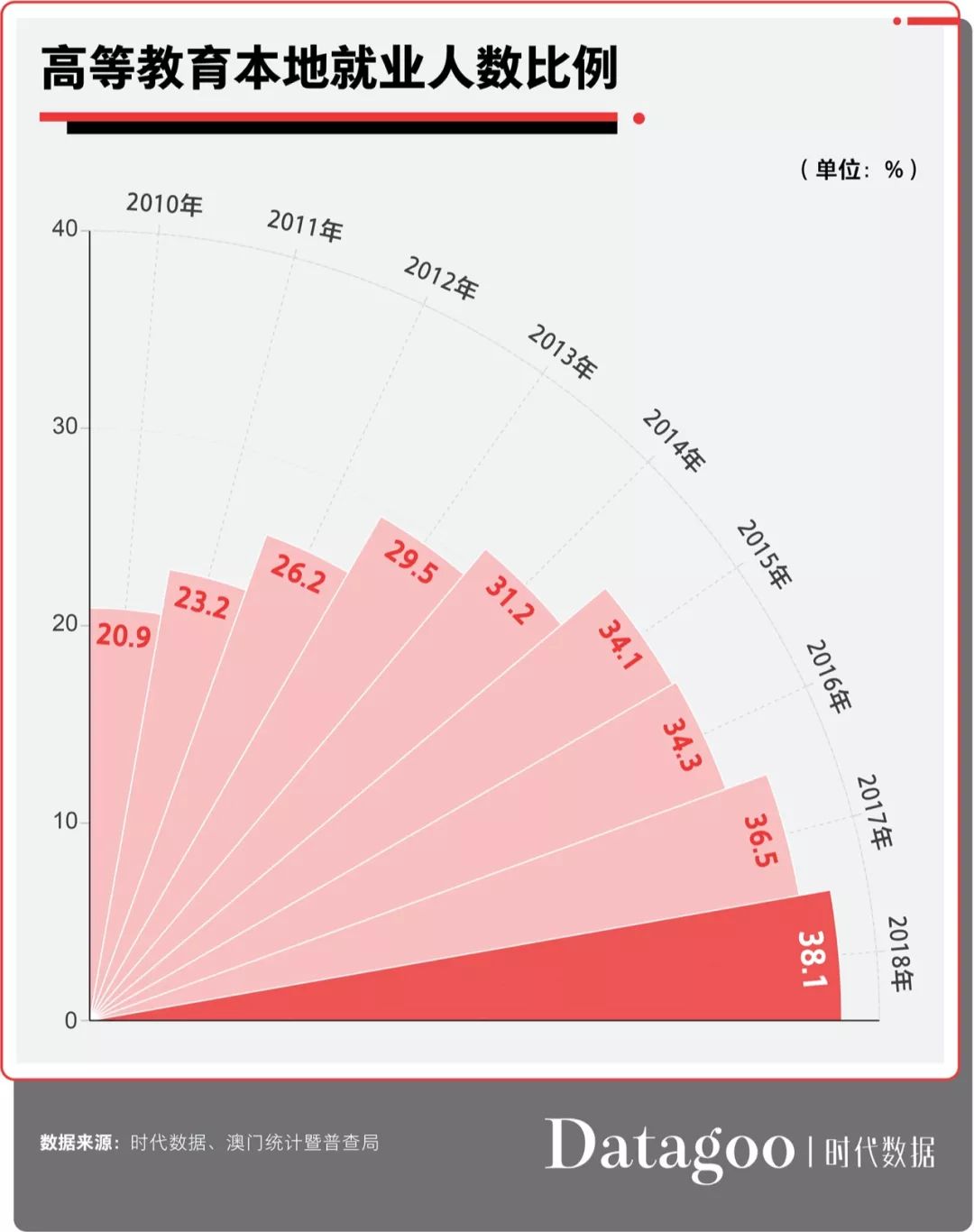 同时,高等教育毕业生本地就业人数比例也从2010年的20.9%增至2018年的38.1%。38.1%的比例意味着,澳门每三个就业人员中,至少有一人具有高等教育学历。