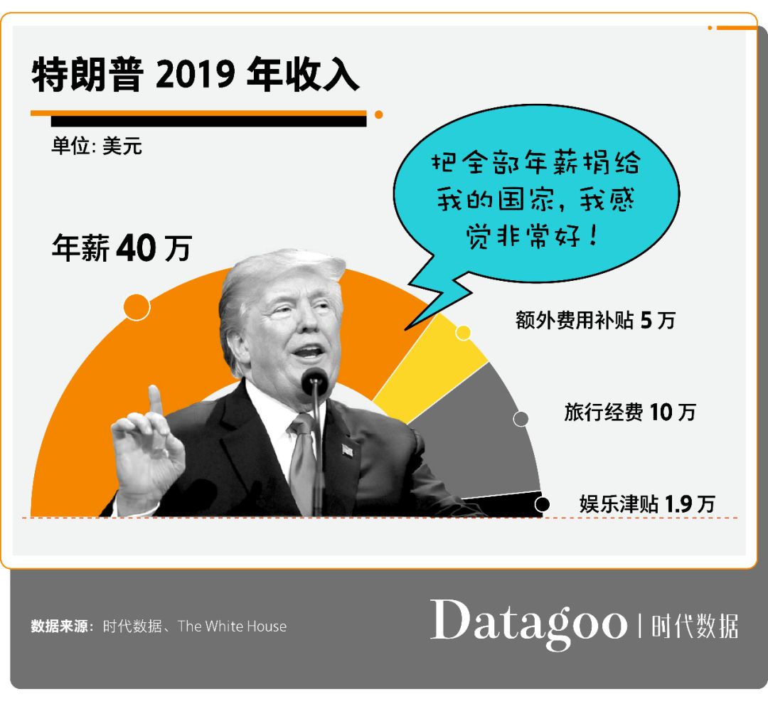美国总统的年薪不低,川普除了有40万美元的年薪外,还有5万美元的额外费用补贴、10万美元的旅行经费和1.9万美元的娱乐津贴。