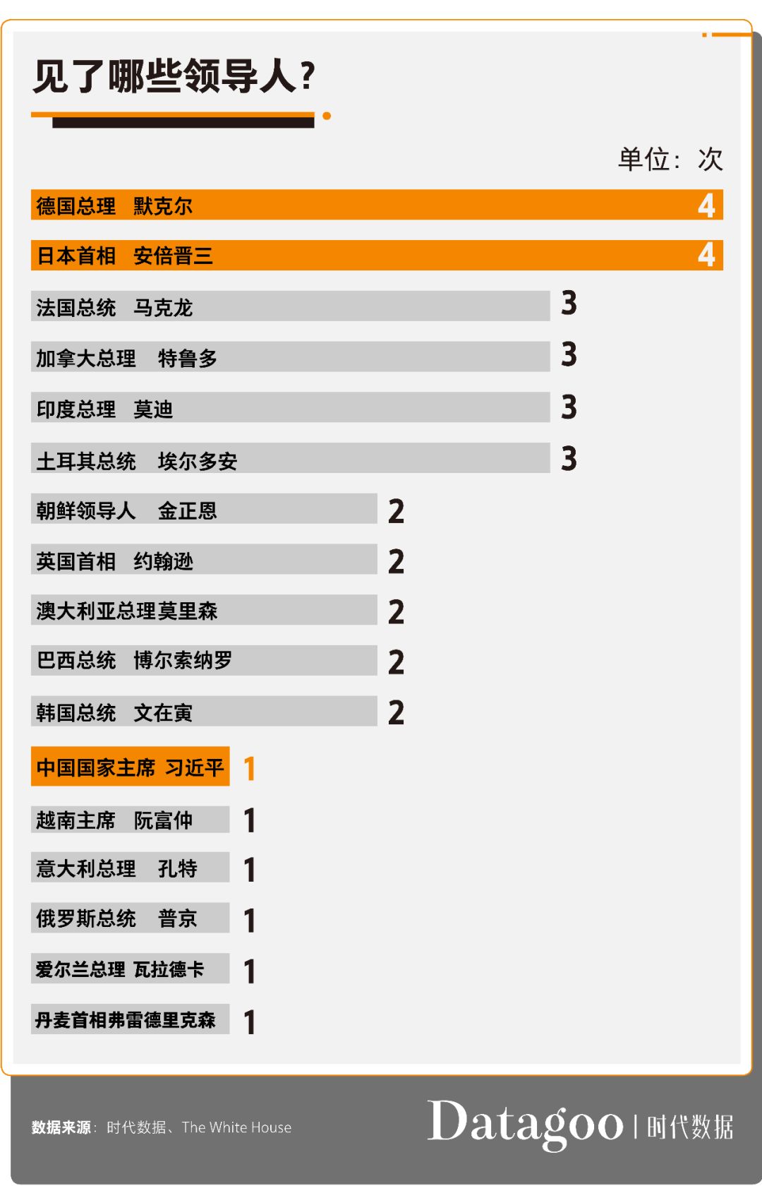 在这一年中,川普总共见了16位国家领导人。其中,与川普会晤最多国家领导人是德国总理默克尔和日本首相安倍晋三,均达到4次;其次是法国总统马克龙、加拿大总理特鲁多、印度总理莫迪和土耳其总统埃尔多安,各3次。值得注意的是,川普与朝鲜领导人金正恩的见面也达到历史最多的两次。