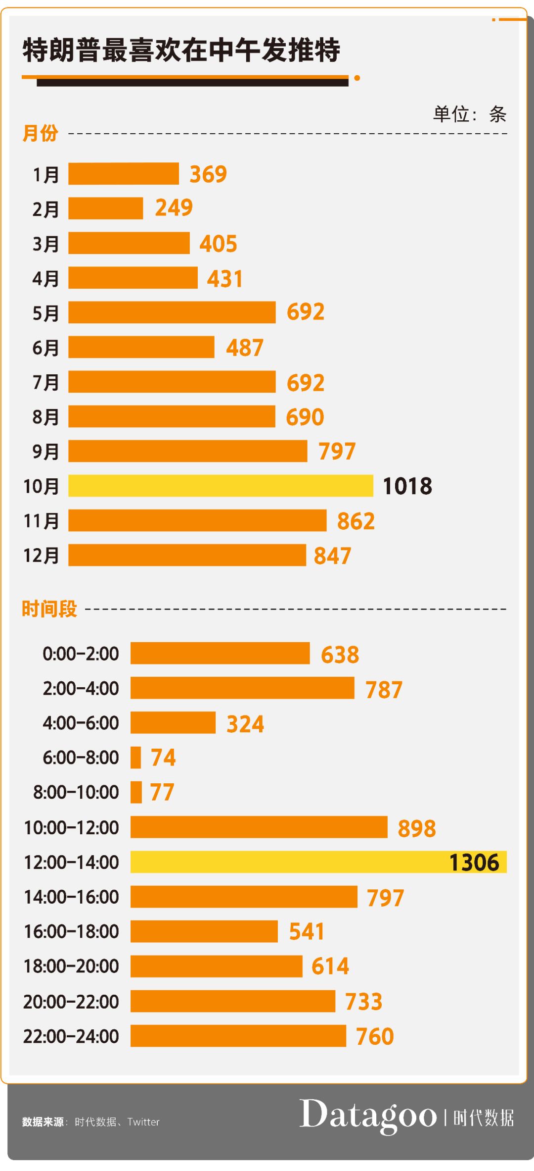 从发推时间上来看,川普在午餐时间段(12:00-14:00)发推最多,达到1306条;其后是午餐前后时间段,各有898条(10:00-12:00)和797条(14:00-16:00)。有趣的是,川普凌晨2点至4点间也忙于发推,达到787条。