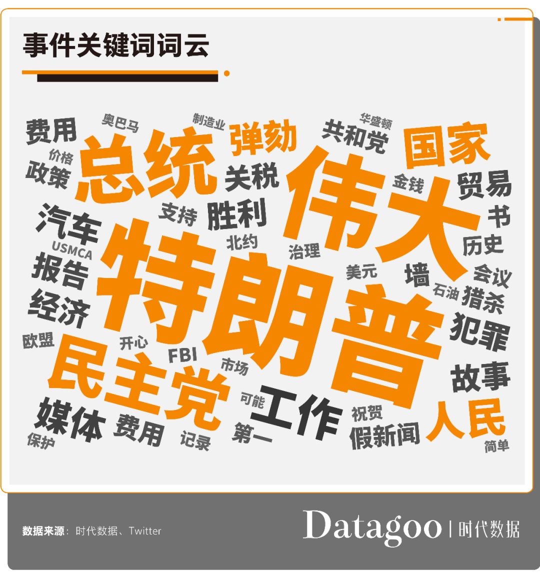 从推文事件关键词方面来看,“特朗普”、“伟大”、“总统”是特朗普使用最多的三个词。