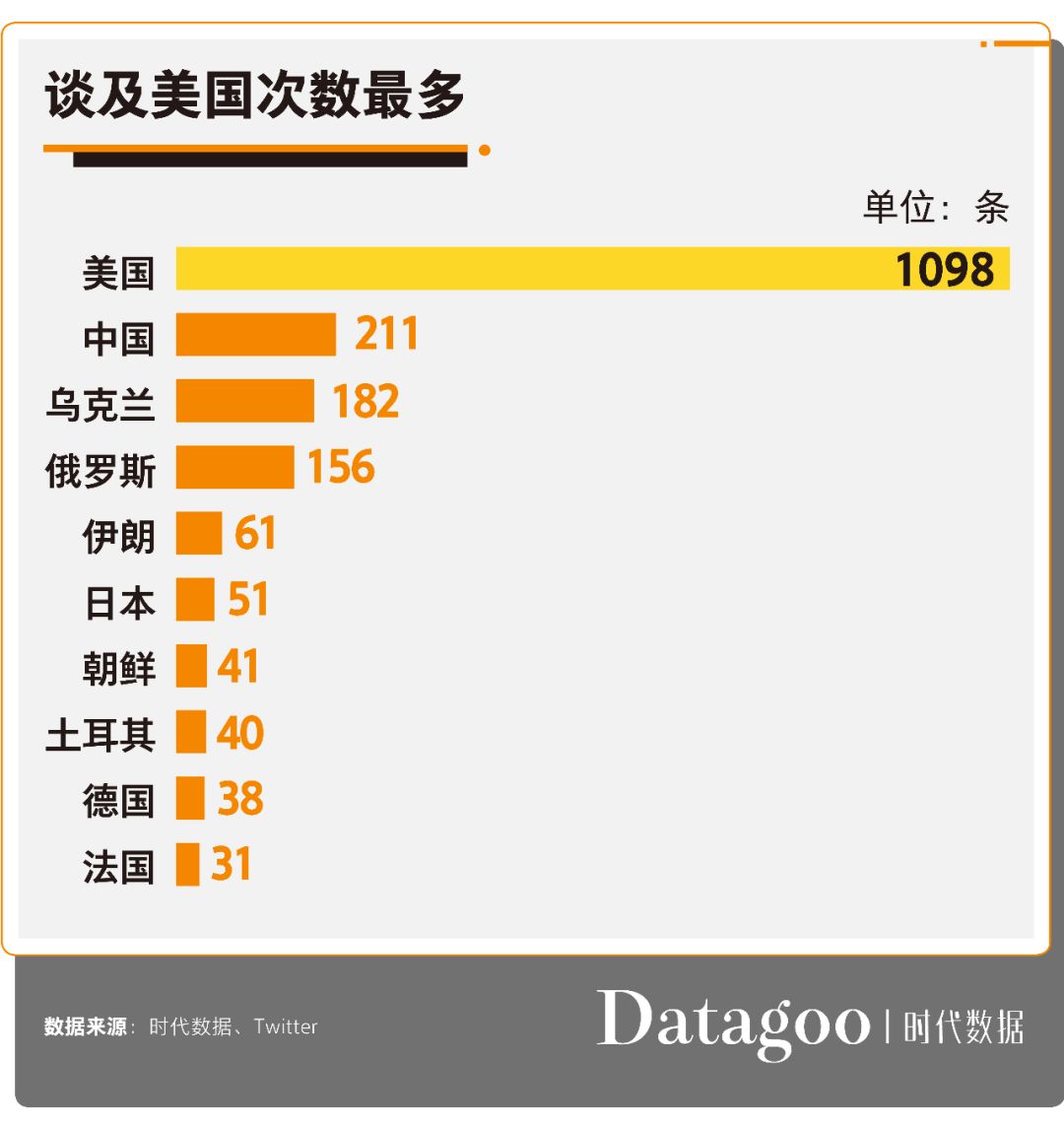 另一方面,一贯奉行“美国第一”的川普,其推文涉及国家最多的也自然是“美国”,达到1098条,内容包括美国的政策、美国的经济、美国的失业率等等好的方面。其次,推文中涉及国家最多的是“中国”,有211条,其内容主要为,围绕中美间贸易,所发表的一些偏向于美国的言论。之后是“乌克兰”(182条)和“俄罗斯”(156条),这也和川普的弹劾事件有关。