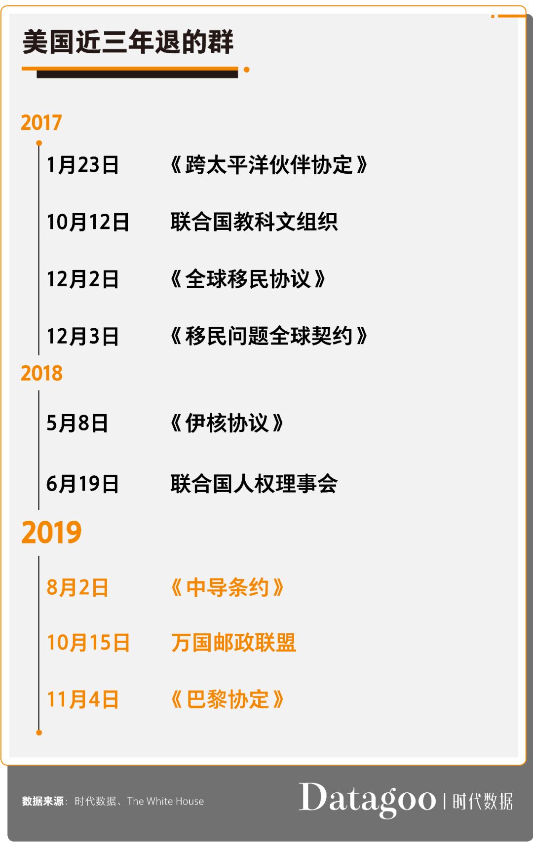 当然,奉行“美国第一”的川普也热衷于一言不合就退群。截至目前,川普以“损害美国制造业”、“牺牲美国就业”、“对美国不公平”等原因先后退了《跨太平洋伙伴协定》、《伊核协议》、联合国教科文组织、联合国人权理事会等国际重大协定和组织。其中,2019年,美国一共退了3个群,分别是《美苏消除两国中程和中短程导弹条约》(以下简称《中导条约》)、《巴黎协定》和万国邮政联盟。