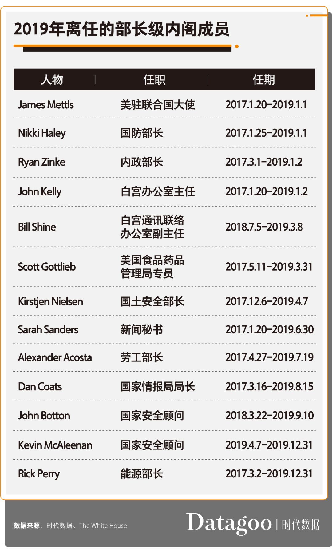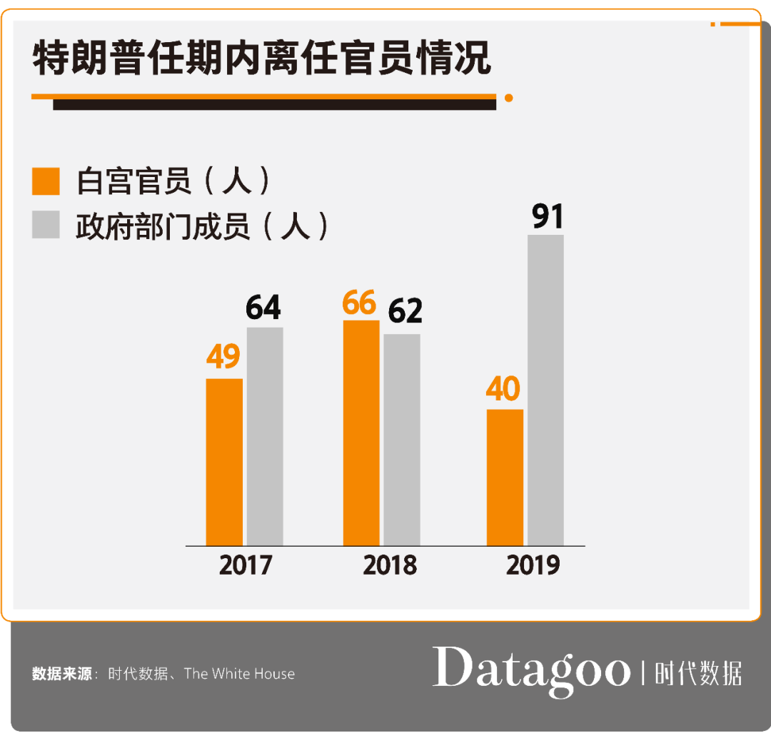 但是,2019年离任的白宫官员和政府部门成员数量创历史最多,达到131人。其中政府部门成员就有91人,是去年的1.5倍。