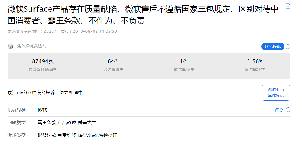 实际上,除了Surface Pro 4以外,早在2018年,微软Surface系列的其他产品同样被用户曝出存在屏幕闪烁等产品质量问题。在聚投诉平台上,有一条包含64个联名帖子的集体投诉,主要内容为Surface系列产品存在屏幕闪烁和抖动、电池鼓包、无法充电、微软售后服务未尽维修和免费换机责任等问题。