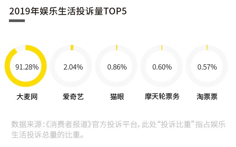与往年数据相比,娱乐生活类投诉增长明显。投诉的消费者中,00后占比远远高于整体消费者,凸显未成年人娱乐生活消费维权的问题较多。从消费者投诉对象来看,大麦网投诉量明显高于同行业其他商家,占比娱乐生活类投诉的总量高达91.28%。