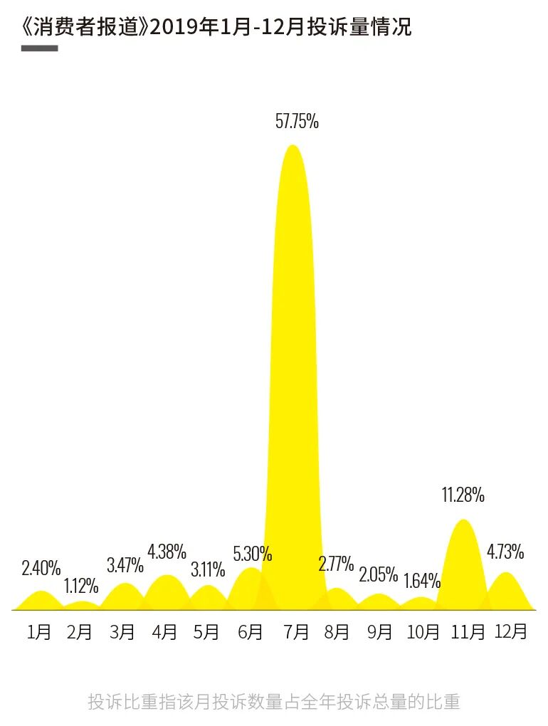 随着时代的发展,消费者的维权意识越来越高,他们正在通过互联网的力量,维护自己的消费权益。2019年,《消费者报道》及全国消协组织共接获消费者投诉88万件。从时间来看,《消费者报道》在2月接获的投诉最少,仅占全年投诉量的1.12%;而到了7月,消费者的投诉量最多,占到了总投诉量的一半。另外11月也是消费者的投诉高峰,占总投诉量的11.28%。这可能与电商平台的两次年度狂欢有关,618和双11带来了大量的消费投诉。对比过往投诉,2014年消费者投诉性质主要以产品质量为主,占比45.8%。而到2019年,消费者投诉主要的是服务。可见,在这五年间,企业的产品质量得到了一定的提升。除了产品质量外,服务质量和企业诚信度也成为企业能否获得消费者认可的重要因素。