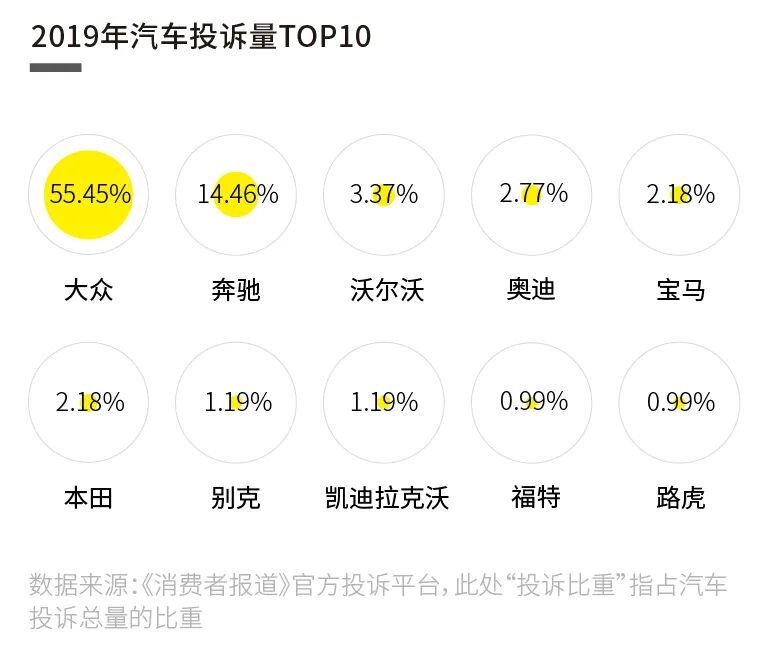 中国消费者协会联合人民网舆情数据中心,基于大数据平台数据与舆情社会影响力测算结果,共同梳理出《2019年十大消费维权舆情热点》。其中,西安奔驰女车主哭诉维权事件社会影响力位居第一。 “西安奔驰女车主维权”一事把汽车的服务和产品质量问题推到了风口浪尖。此前,《消费者报道》曾收到多件关于汽车问题的投诉,主要反映汽车行业存在产品质量缺陷、厂商经销商销售套路多、售后服务不到位等乱象。其中,大众汽车投诉量最多,奔驰汽车次之。