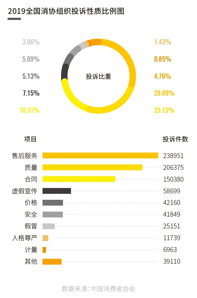 2019年,全国消协组织是消费者投诉的主要渠道。消费者投诉的问题主要以售后服务、质量、合同为主。
