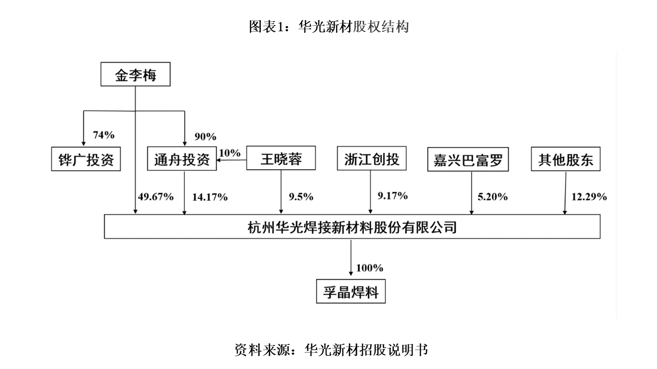 华光新材前身为杭州华光焊接材料有限公司,成立于1997年11月19日。最初设立时,杭州河西实业总公司持股51%,自然人徐清、王德法分别持股48%、1%。截至招股说明书签署日,华光新材控股股东、实际控制人为金李梅。公司股权结构图如下: