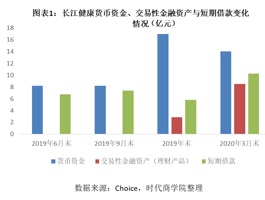 考虑到因无法对子公司华信制药实施审计而导致2019年数据不真实,其2019年数据的暂不做参考。然而,在华信制药不再纳入其合并范围的2020年一季度,长江健康依然有8.51亿元的交易性金融资产(基本为理财产品)、14亿元货币资金与10.24亿元短期借款、4.36亿元的长期借款共存。莫非理财产品的收益已高于借款利息?