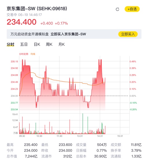 首个交易日,京东集团股价高开5.7%,市值一度冲至7385亿港元,市场看多表现强烈,最终收盘于234港元,较发行价226港元上涨3.54%,当日成交额也创下70亿港元,与腾讯控股(0700.HK)共同成为当日港股主板的两大成交主力。