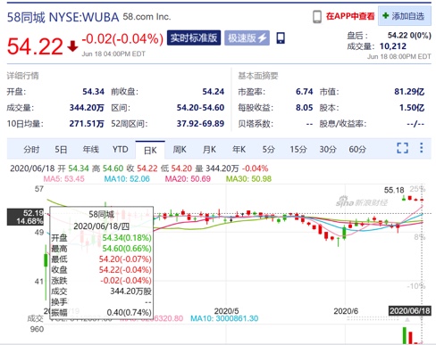 截至6月18日美股收盘,58同城报收54.22美元,跌幅为0.04%,市值约为81.3亿美元。