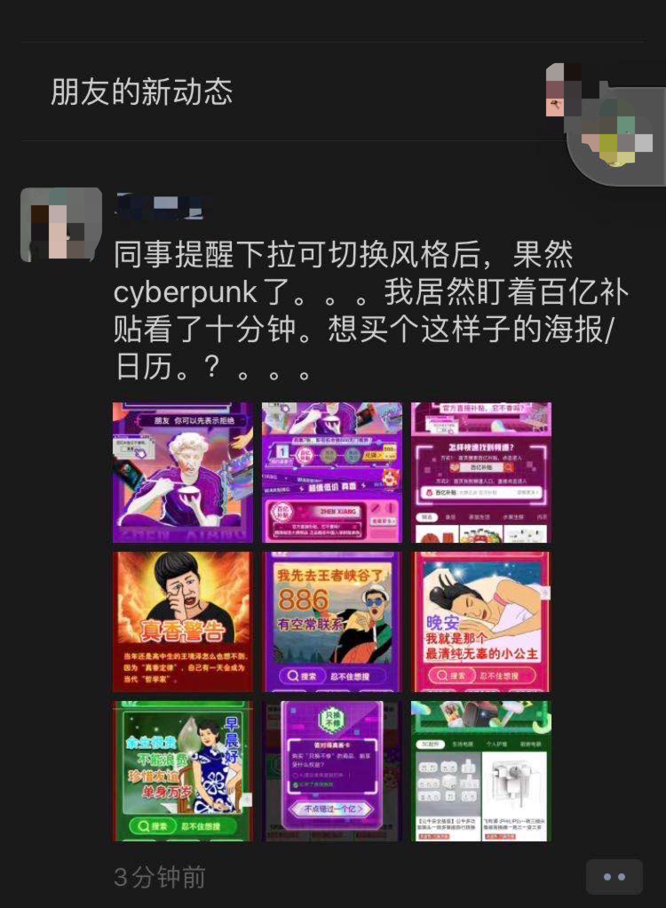 另一方面,此次活动主题也以乐趣为主。“真香节”的活动主题页分为了“中年版”和“青年版”。中年版延续了网络流行的“中年表情包”风格,用户在页面中还可以一键切换至赛博朋克风格的“青年版”。
