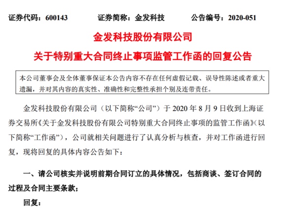 至此,金发科技认为,本次合同订单未得到买方的履行,合同订单实际已经终止,随后在8月10日发布《金发科技股份有限公司关于子公司特别重大合同终止的公告》。