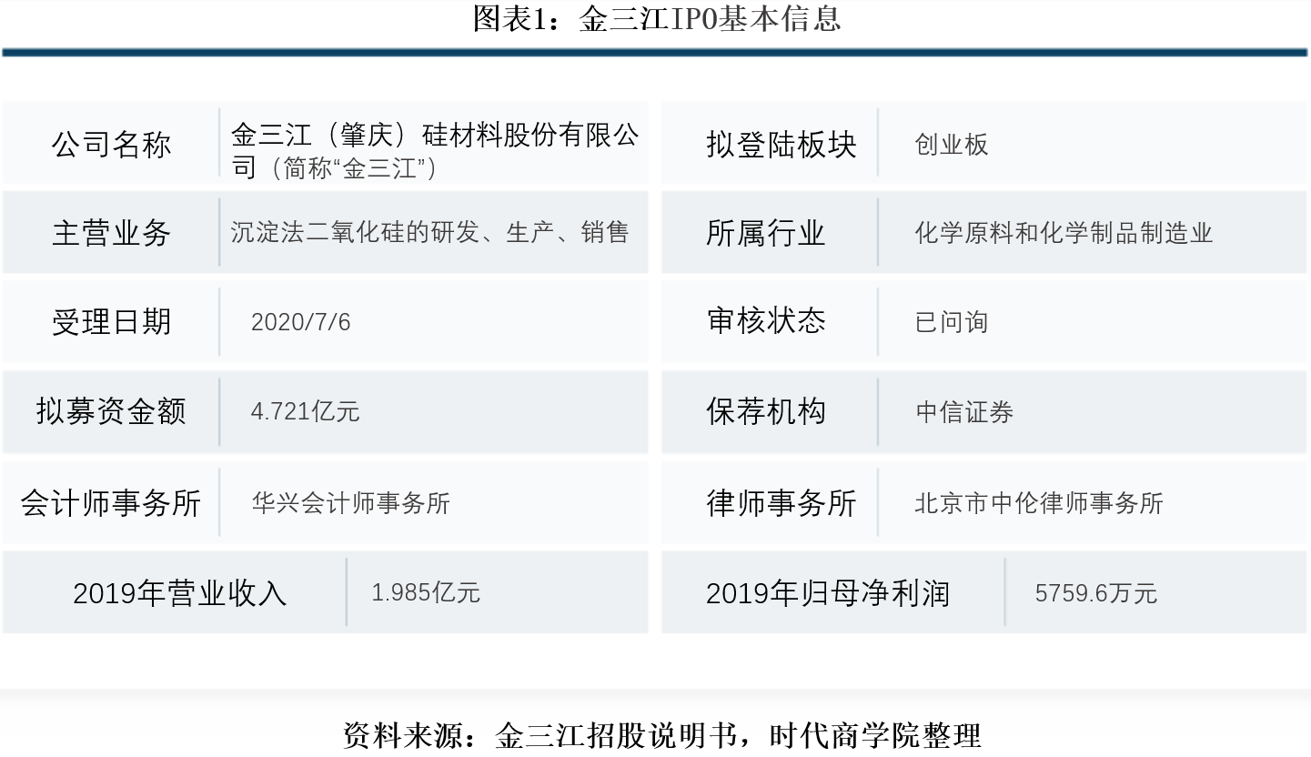 金三江(肇庆)硅材料股份有限公司(以下简称“金三江”)主营沉淀法二氧化硅的研发、生产和销售,目前主营业务收入中占比最大的产品为摩擦型二氧化硅、增稠型二氧化硅。据深交所官网披露,7月6日,金三江创业板IPO申请已获受理。