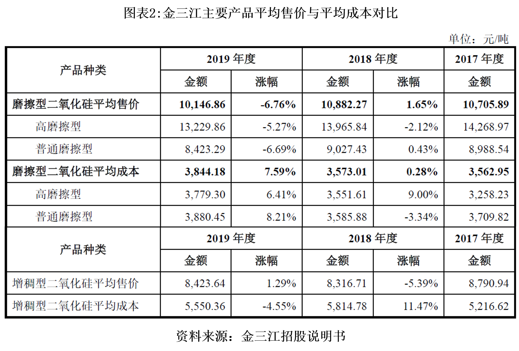 跟踪金三江报告期以来的产品价格走势、平均生产成本、综合毛利率等经营数据,发现该公司2017—2019年整体上呈产品售价下滑,生产成本上升,毛利率下滑的趋势。2017—2018年摩擦型二氧化硅平均单价从10705.89元/吨下降至10146.86元/吨,而对应的生产成本从3562.95元/吨上升至3844.18元/吨,毛利率下降4.61个百分点至62.11%。