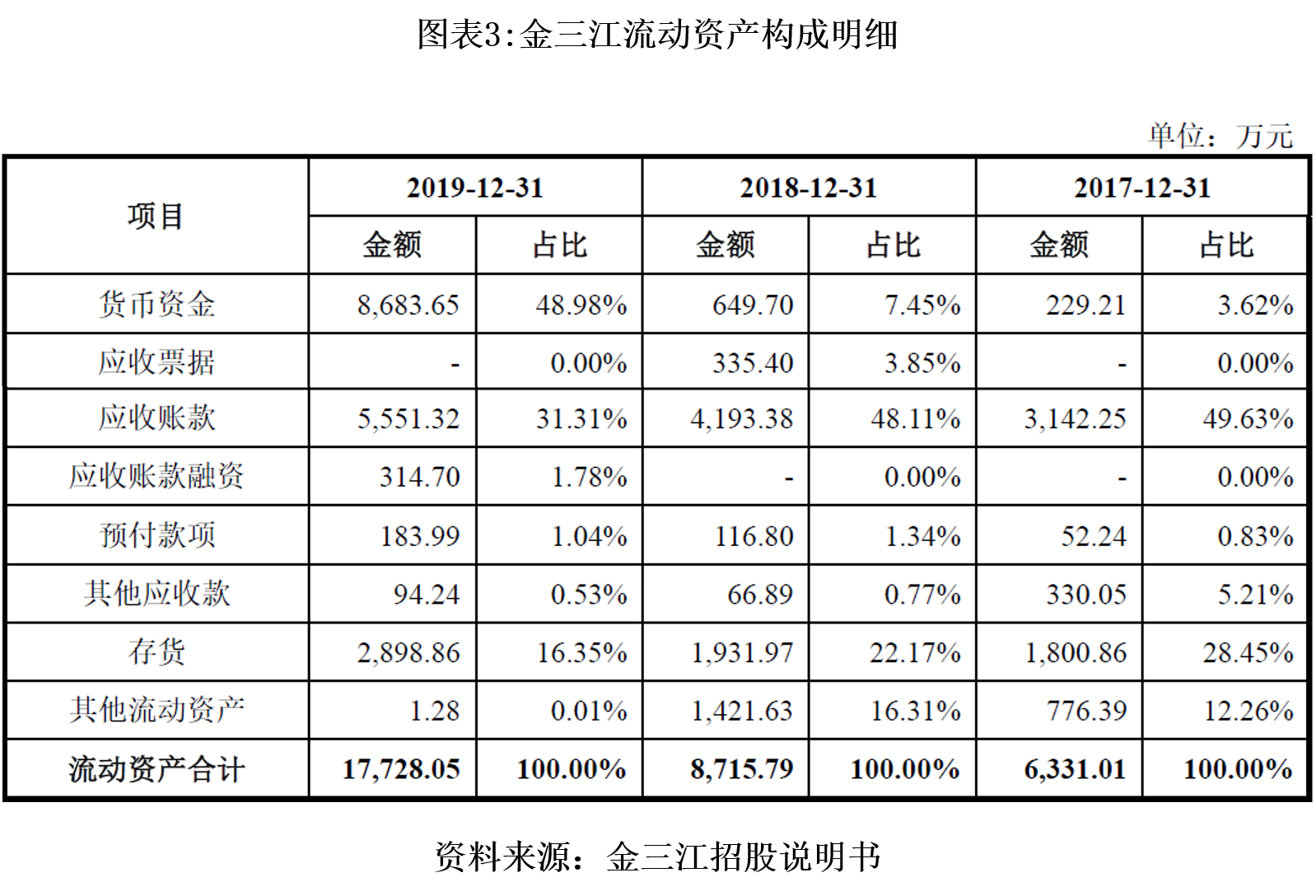 2017—2019年,该公司存货账面价值分别为 1800.86 万元、1931.97 万元、2898.86万元,占流动资产的比例分别为28.45%、22.17%、16.35%,存货资产占比较高。从明细项看,库存商品占比最高, 2019年63.3%的存货为库存商品,其次是低值易耗品、原材料。从存货的具体明细分布看,库存商品、低值易耗品、原材料都存在一定的跌价损失风险。