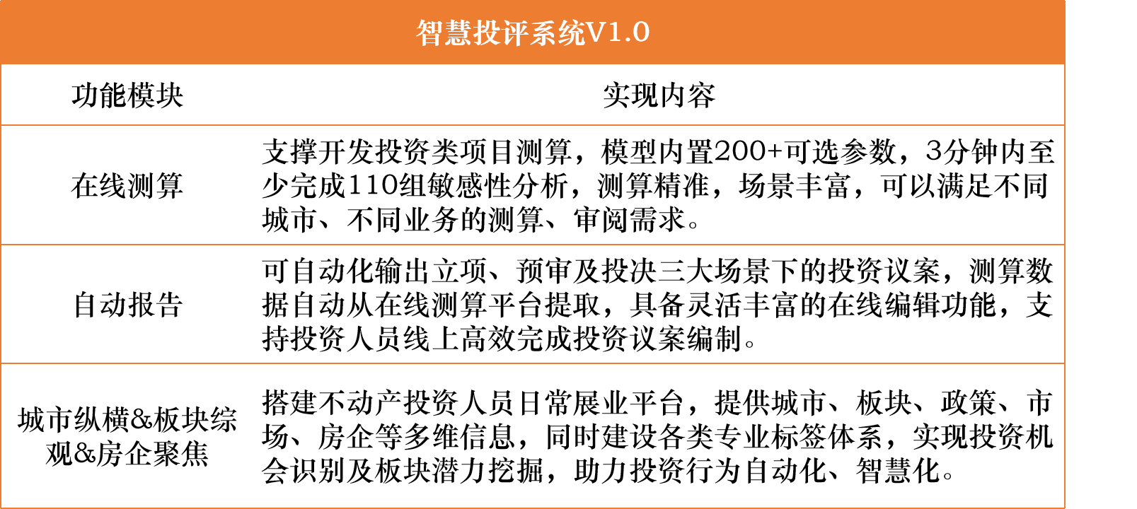 智慧投评系统是KYR的重要组成部分,可帮助平安不动产全面实现不动产投资评审行为线上化,包括在线测算、自动报告、城市纵横、板块综观、房企聚焦等核心功能与模块,多角度对投资项目进行智能评审(如下表)。