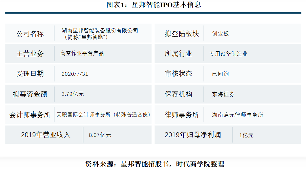 湖南星邦智能装备股份有限公司(以下简称“星邦智能”)是国内一家从事高空作业平台研发、生产、销售和服务的企业,产品种类主要包括直臂式、曲臂式、剪叉式、车载式、蜘蛛式和套筒式六大系列。7月31日,星邦智能IPO申请进入问询阶段,拟于创业板上市。