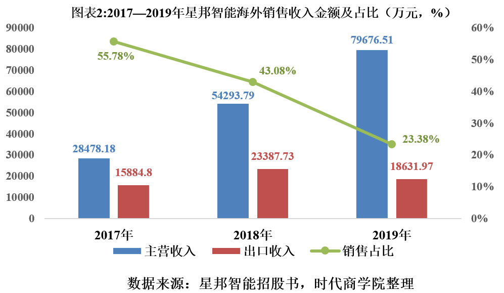 如图表2所示,2017—2019年,星邦智能出口销售收入分别为15884.8万元、23387.73万元和18631.97万元,分别占当期主营业务收入的55.78%、43.08%和23.38%,2019年的销售收入同比减少20.33%,占比也出现较为明显的下降。