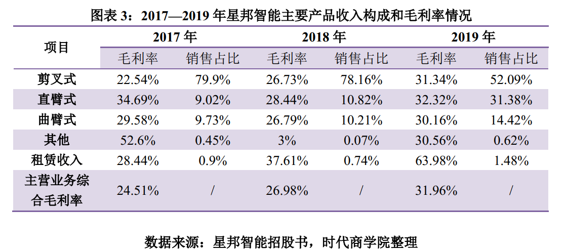 招股书显示,2017—2019年,星邦智能主营业务综合毛利率分别为24.48%、26.91%和31.47%,而同期可比公司综合毛利率均值分别为34.96%、34.65%和34.82%,明显高于星邦智能。