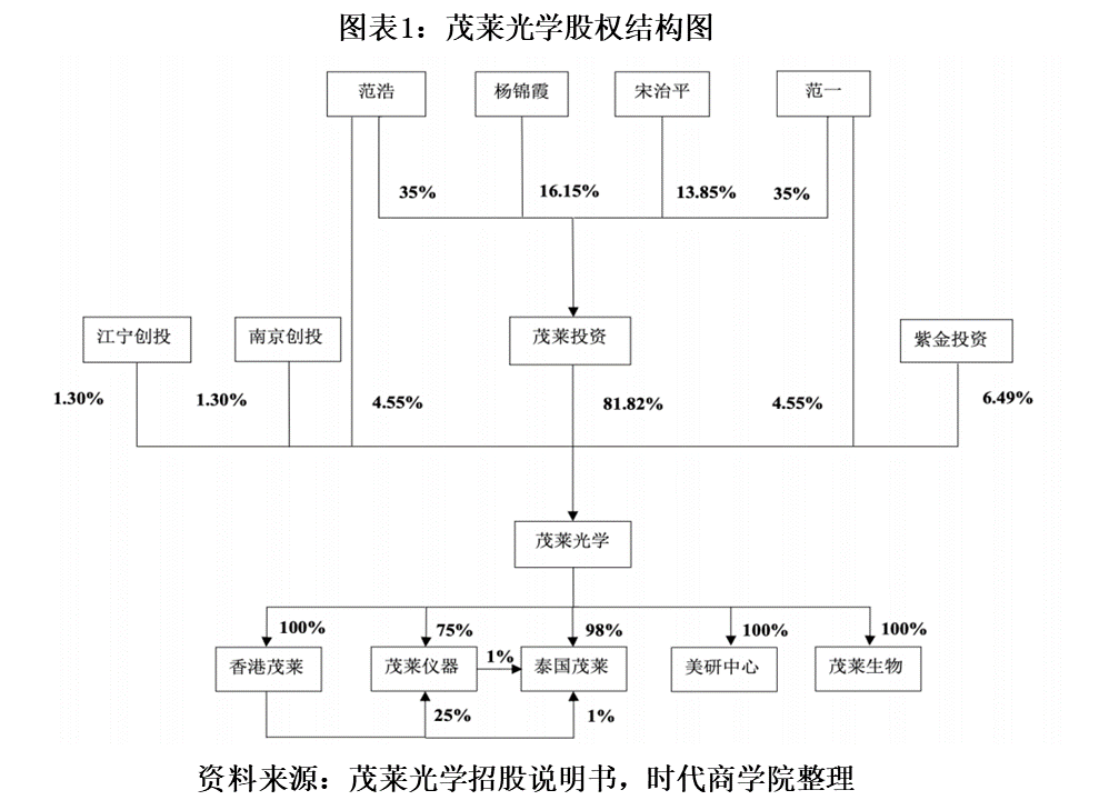 茂莱光学的前身为南京茂莱光电有限公司(以下简称“茂莱有限”),成立于1999年8月,注册地址为南京市江宁开发区,由茂莱投资与星海公司共同出资设立,2008年星海公司将其所持茂莱有限股权转出。2015年,茂莱有限变更为股份有限公司。茂莱光学的实际控制人为范一、范浩兄弟,两人直接持有茂莱光学9.09%的股份,通过茂莱投资间接持股57.27%,合计持股66.36%。杨锦霞系范一、范浩之母,持有茂莱投资16.15%的股份。茂莱光学的股权结构图如下: