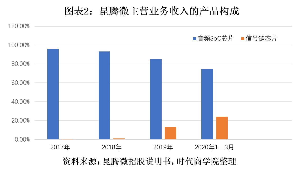时代商学院查阅其招股书发现,报告期内,昆腾微主营产品的收入贡献有较大变化。该公司的核心产品为音频SoC芯片和信号链芯片,其中,报告期内音频SoC芯片产品占主营业务收入比重分别为95.69%、93.26%、84.91%和74.54%,信号链芯片占主营业务收入的比重分别为0.52%、1.10%、13.13%和24.2%。可见,信号链芯片对营收的贡献度在提升。