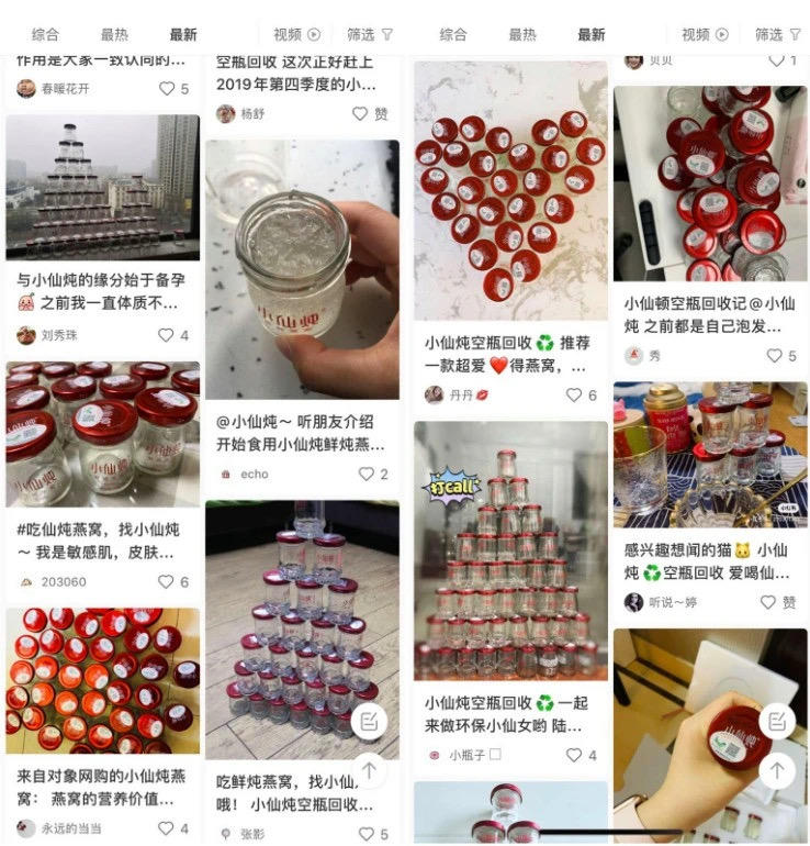 不可否认,在年轻一代消费者心目中,小仙炖已经与”鲜炖燕窝“划上等号。陈数那句“家里空瓶可以垒成一面墙”,引发了一场网络接龙,在微博、小红书上“晒空瓶”的接龙自发展开,在高端社会网络中形成共振效应,也是高端品牌的影响力所在。