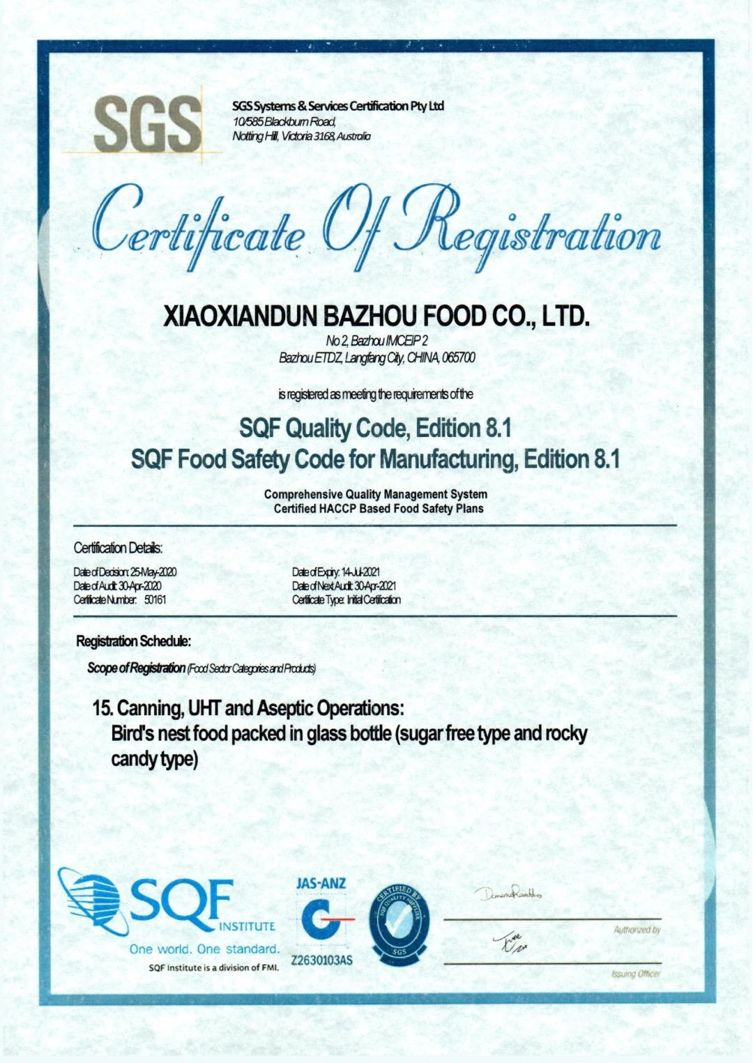 小仙炖依托于创新鲜炖燕窝工艺,建立行业内率先获得鲜炖燕窝方便食品SC认证工厂,同时也在行业内率先通过SQF食品安全规范与质量规范认证。