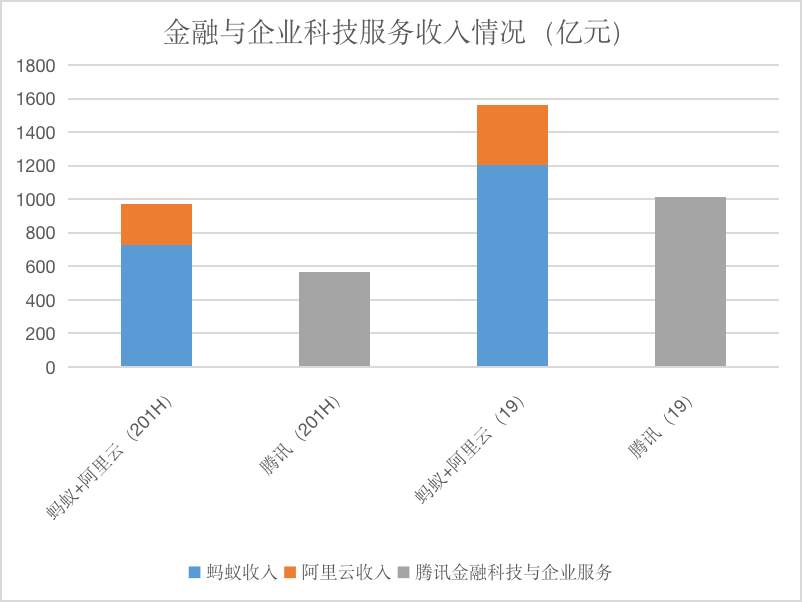 渗透企业客户的核心要素有两个,云和金融科技。由于蚂蚁集团财务状况已经披露,可以按照腾讯将金融和企业服务业务合并的财务口径,比较目前两者近疫情前后的收入规模。今年上半年在疫情影响下,阿里、蚂蚁两个板块对应收入,已接近去年腾讯全年水平。