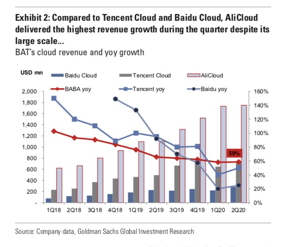 其中,在代表基础科技能力的云计算上,腾讯选择连续两个季度未单独披露述职,按照高盛的推算,在2020年前两个季度,腾讯云季度收入约在40~50亿元之间,同比增速分别降至40%和50%;增速甚至明显低于营收规模约2.5倍大的阿里云。阿里云在2017年第四季度相当的营收规模下,同比增速能保持在90%以上。