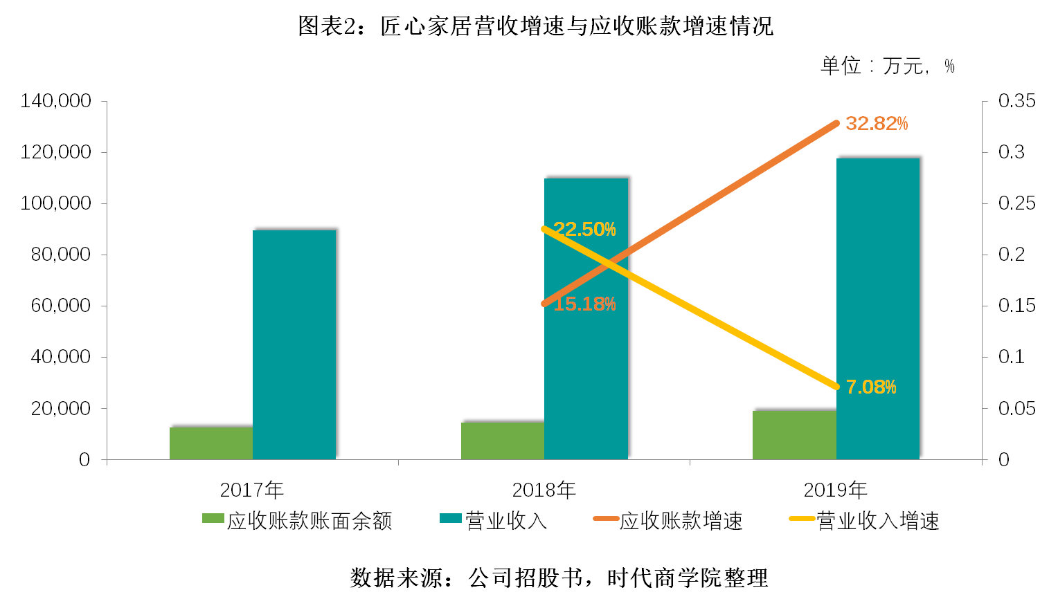 2017—2019年期末,匠心家居应收账款账面余额分别为1.24亿元、1.43亿元、1.9亿元,增速分别为15.18%、32.82%。同期,该公司营业收入分别为8.96亿元、10.97亿元、11.75亿元,增速分别为22.5%、7.08%。