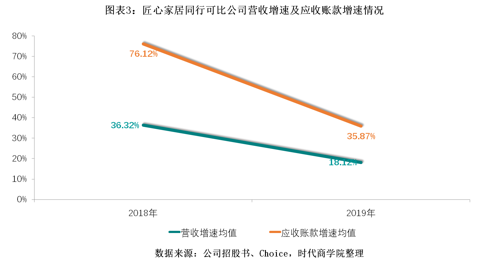匠心家居最近一年的营业收入增速放缓,而应收账款激增。中源家居、麟盛科技、顾家家居、恒林股份等作为该公司的可比上市公司,2018年、2019年的营收增速均值分别为36.32%、18.12%,呈下滑趋势。同期,行业应收账款增速均值则分别为76.12%、35.87%,与营收增速同步,呈下跌态势。