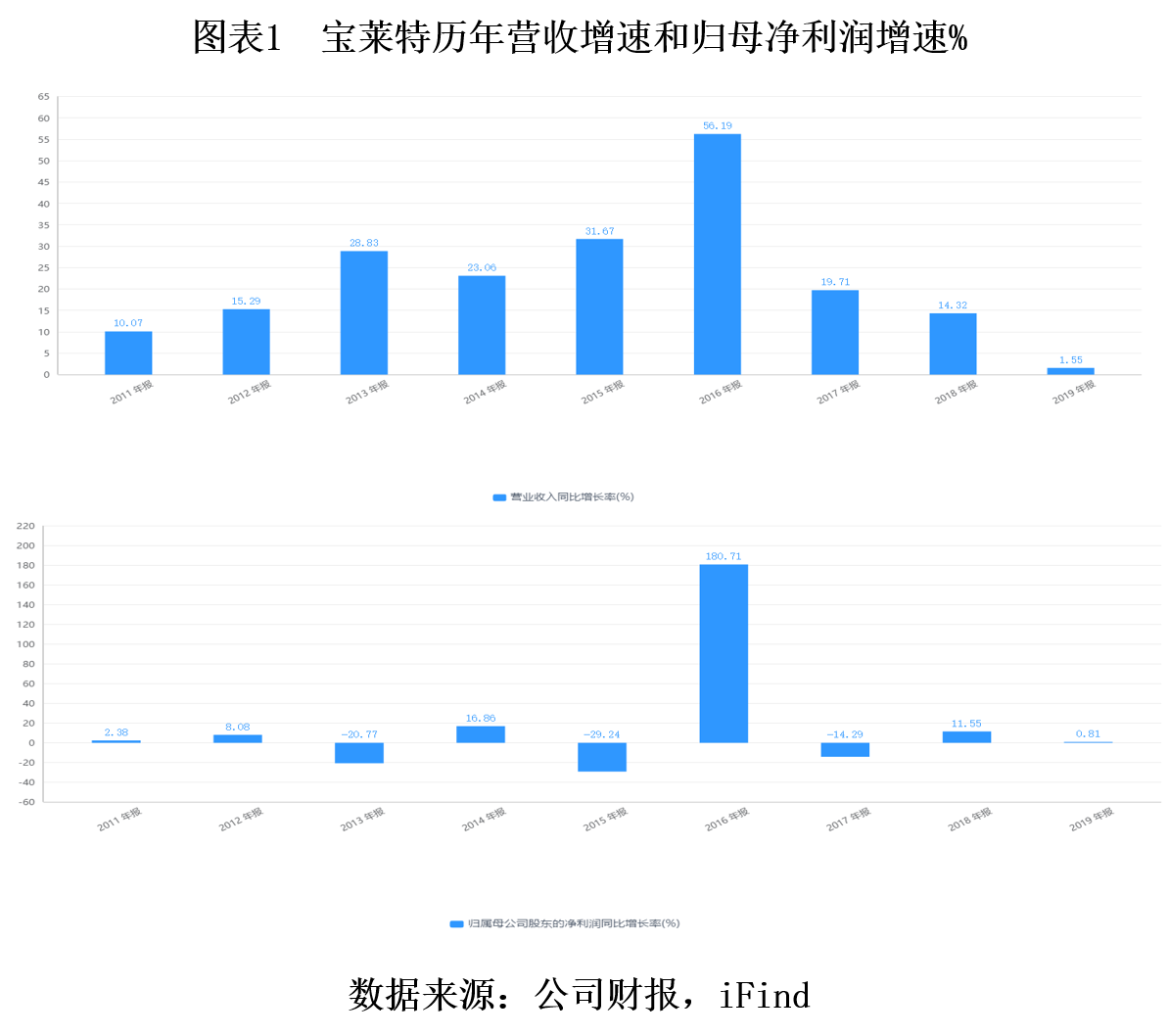 宝莱特以健康监测和血液透析两大业务作为主营业务,然而2016年以来,其健康监测板块业务规模不断萎缩,血液透析业务增速也不断下滑,血液透析建设的南昌项目以“龟速”进行,建设近七年仍未投入使用。两大业务发展缓慢使得公司整体营收增速下滑至2019年的1.55%,归母净利润增速下滑至2019年的0.81%。