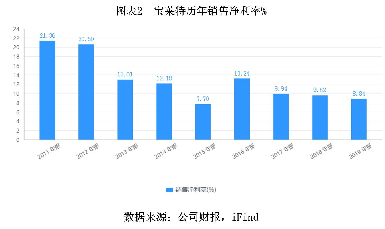 除了业务规模萎缩,宝莱特整体的销售毛利率和销售净利率也在逐步下滑。2011年,该公司销售毛利率和销售净利率分别为47.64%、21.36%,2019年则分别为39.77%、8.84%,相对2011年分别下跌7.87、12.52个百分点。从毛利率、净利率指标变动趋势看,该公司所经营产品的市场竞争力逐步下滑,销售难度增加,难以维持原有的产品议价能力和产品畅销度。