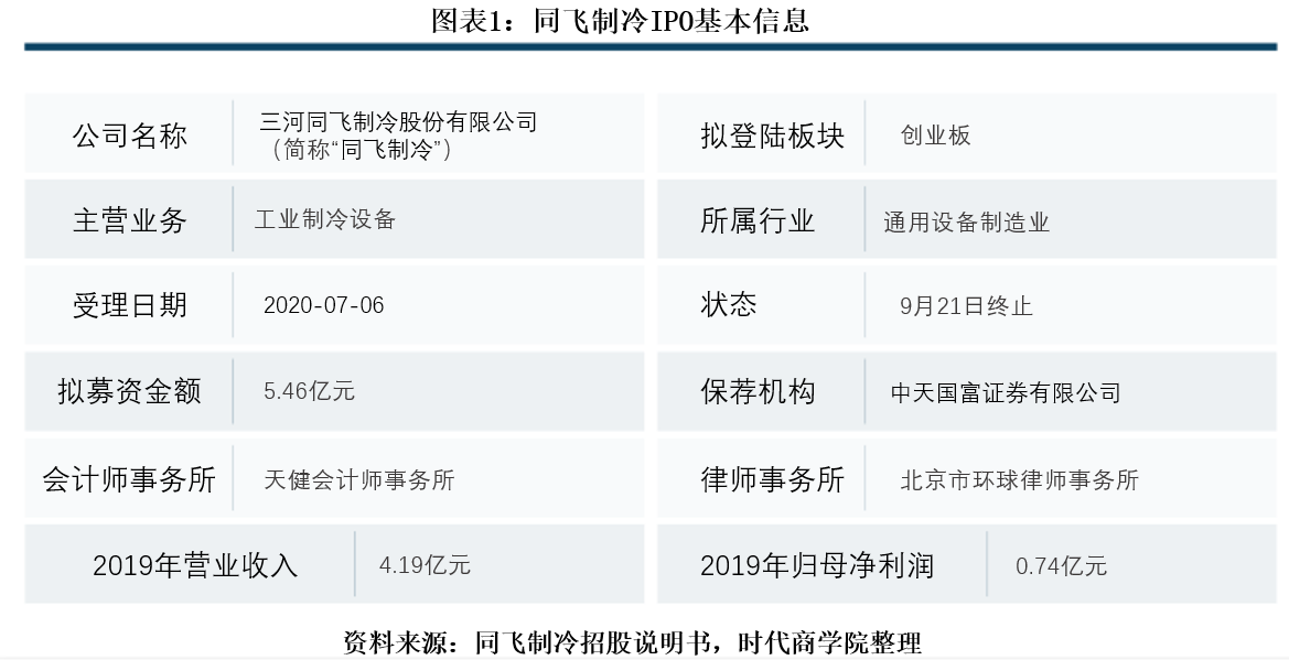 7月6日,同飞制冷的创业板IPO申报获深交所受理,9月21日其因更新财务资料,申请中止IPO申报。