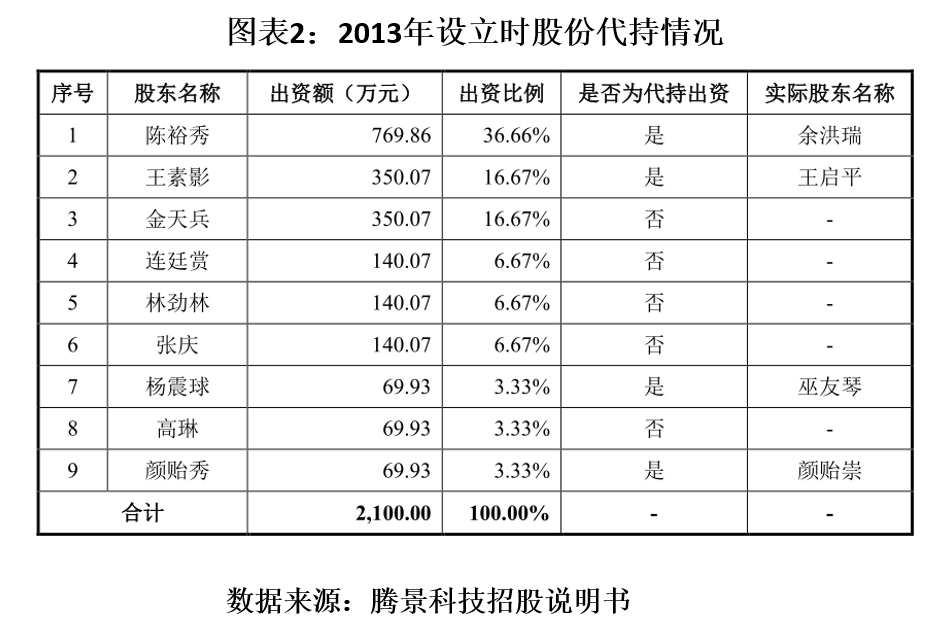 招股书显示,腾景科技设立早期存在大量股份代持情况,涉及人员包括实控人余洪瑞和王启平。如图表2所示,腾景科技2013年设立时,余洪瑞的股份由陈裕秀代持,王启平的股份由王素影代持。直到2016年4月,各方才解除代持,将股份还原。对于代持的原因,腾景科技并未作出解释。